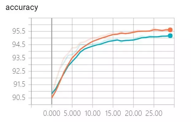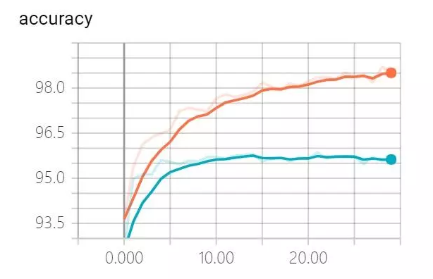 mini batch:10;训练过程中,分别对训练集和验证集的识别精度进行了跟踪,如下图所示,其中红线代表训练集识别率,蓝线代表测试集识别率。图中显示,大约在第15次迭代前后,测试集的识别精度稳定在95.5%不再提高,而训练集的识别精度仍然继续上升,直到30次迭代全部结束后达到了98.5%,两者相差3%。